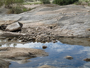 | We enjoyed the rock pools of the Uob, a normally parched valley which this year had had a Thames-size continuous flow for 53 days. The Uob is a tributary of the Kuiseb which this year broke through to the sea at Walvis bay, carrying with it out into the South Atlantic most of central Namibia’s soil and the Walvis Bay water purification plant. We shared the pools with frogs and terrapins who spent a brief week or two frantically breeding before sinking back into many years sleep underneath the riverbeds before the next chance arises. An odd life but not, I suppose, unpleasant. | ||||||||
