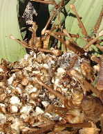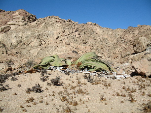 Welwitchias have no known relative. They appear to be conifers. They grow two leaves only, a few centimetres longer in a good year. The leaves split and dry out at the ends. They have a long root to reach what water they can find. This is probably many centuries old. The close-up of the 'cones' - far right - shows the large numbers of the spotty mealy bug that live on them. But you cant see them because, like most other things that live around here, they are so well camouflaged |