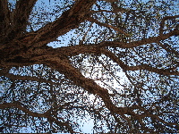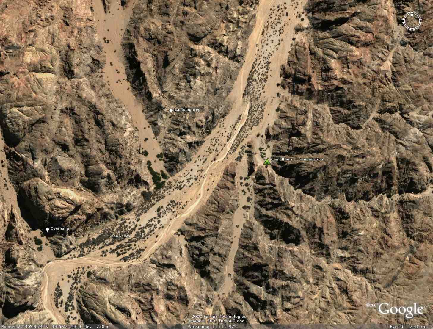 A camelthorn tree is a complex ecosytem. Lots of creatures survive in its bark and its seeds are protein rich; caviare to the desert elephants. No elephants here though. | I’m in the Khan valley. Found a perfect camping spot up a side valley to the south under a Camelthorn. 30km from anyone. The only sound is the occasional noise of an aeroplane and the very distant 10.30 rumble of the blasting in the Rossing pit 30 km upriver where the big boys are disembowelling the desert to satisfy the Chinese demand for Uranium. Over 10% of the world uranium comes from within 50 miles of where I’m sitting. Otherwise its just me and the barking gekkos. Hottish days and cool fullmoon nights The Google Earth view of the area - the Camelthorn is just below the tent icon - shows the river. dry most of the time but now and then a spectacular torrent that washes all central Namibia's hard-won soil into the south Allantic. The flood can be 4m deep and cross the whole valley and washes away everything, including, quite often, the bridge at Usakos, about 50km upstream from here. It's been doing it for millions of years and gouged out this 250m deep ravine through a granite plateau, down which I drove to get here. |