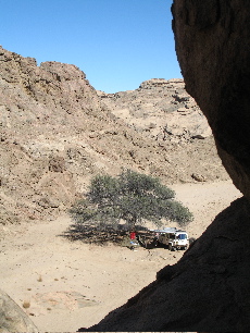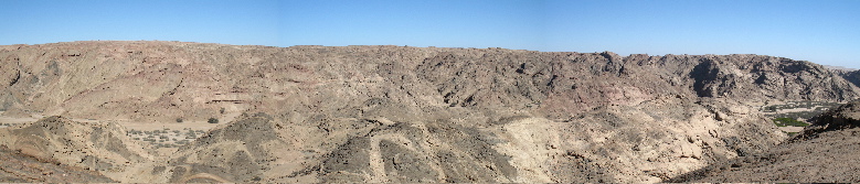 | This is a photostitch of the valley from its north bank. On the right is the abrupt 90 degree bend that is at the bottom of the Google picture. The tree and the landrover are actually visible almost in the exact centre of the picture. The dry catarat I inadvertently found myself at the top of just after I left the Welwitchia is clearly visible about a quarter of the way along from the left | ||||